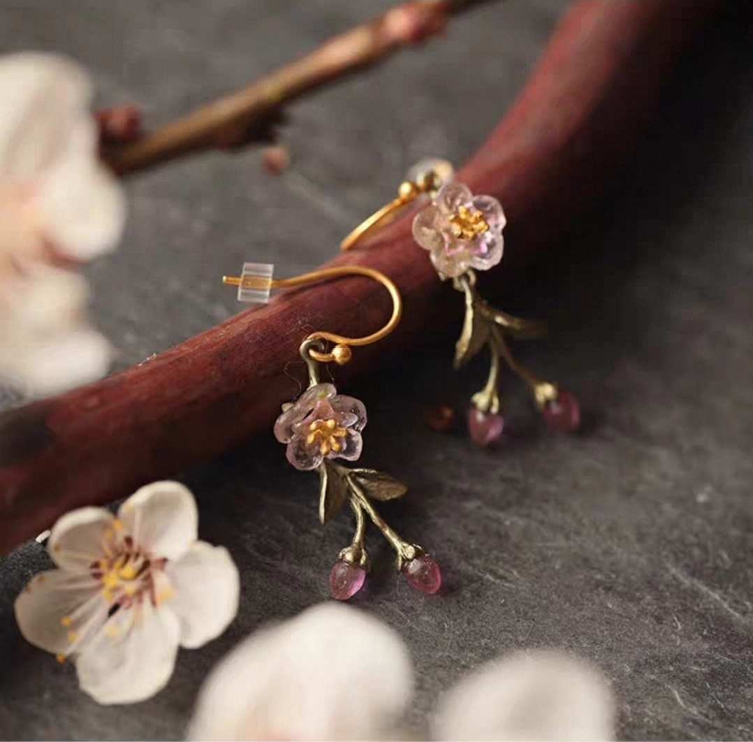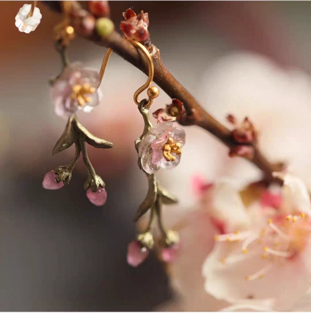 Peach blossoms are a type of flower that are native to China and have been cultivated for thousands of years. They are typically pale pink in colour and have a delicate and sweet fragrance. Peach blossoms have long been associated with love, romance, and prosperity. In ancient Chinese poetry and art, peach blossoms were often used as a symbol of feminine beauty and elegance. They are also considered to be a symbo of spring and the renewal of life. Peach blossoms typically bloom in early spring, just as the weather starts to warm up and the days begin to lengthen. The sight of the delicate pink flowers is seen as a sign of the end of winter and the beginning of a new season. With a rich history and cultural significance, the peach blossom is a beautiful and meaningful flower. Materials: The leaves and twigs of the Peach Blossom earrings are cast in green hand patinated bronze. The earrings are accented with dainty cast glass flowers and buds in pale and dark pink with gold plated centres. The wires are 925 silver with a 24kt gold plating. Measures: 1.26" L x 0.53" W