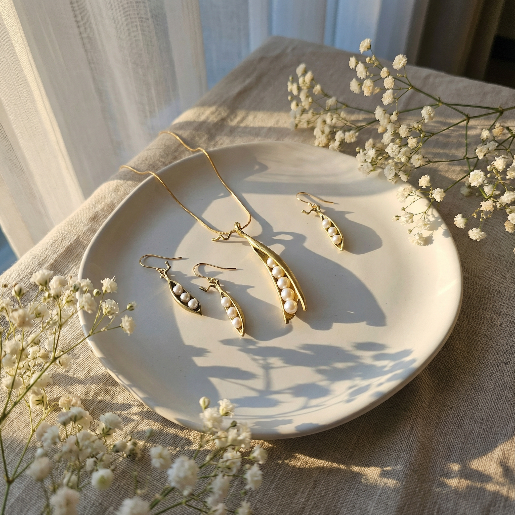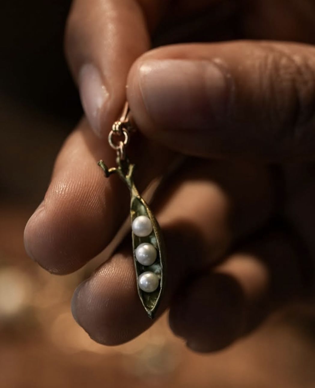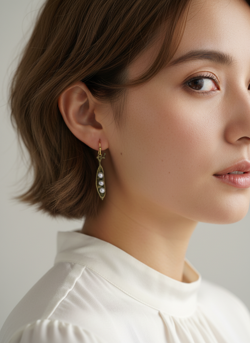 如果說貼耳式耳環是一份安靜的陪伴,那麼這款垂墜耳環就是一段靈動的對話。豌豆莢象徵著「生命的孕育」與「緊密的連結」,三顆珍珠則代表著生活中最珍視的人事物——或許是親情、愛情與友情的三重奏 。