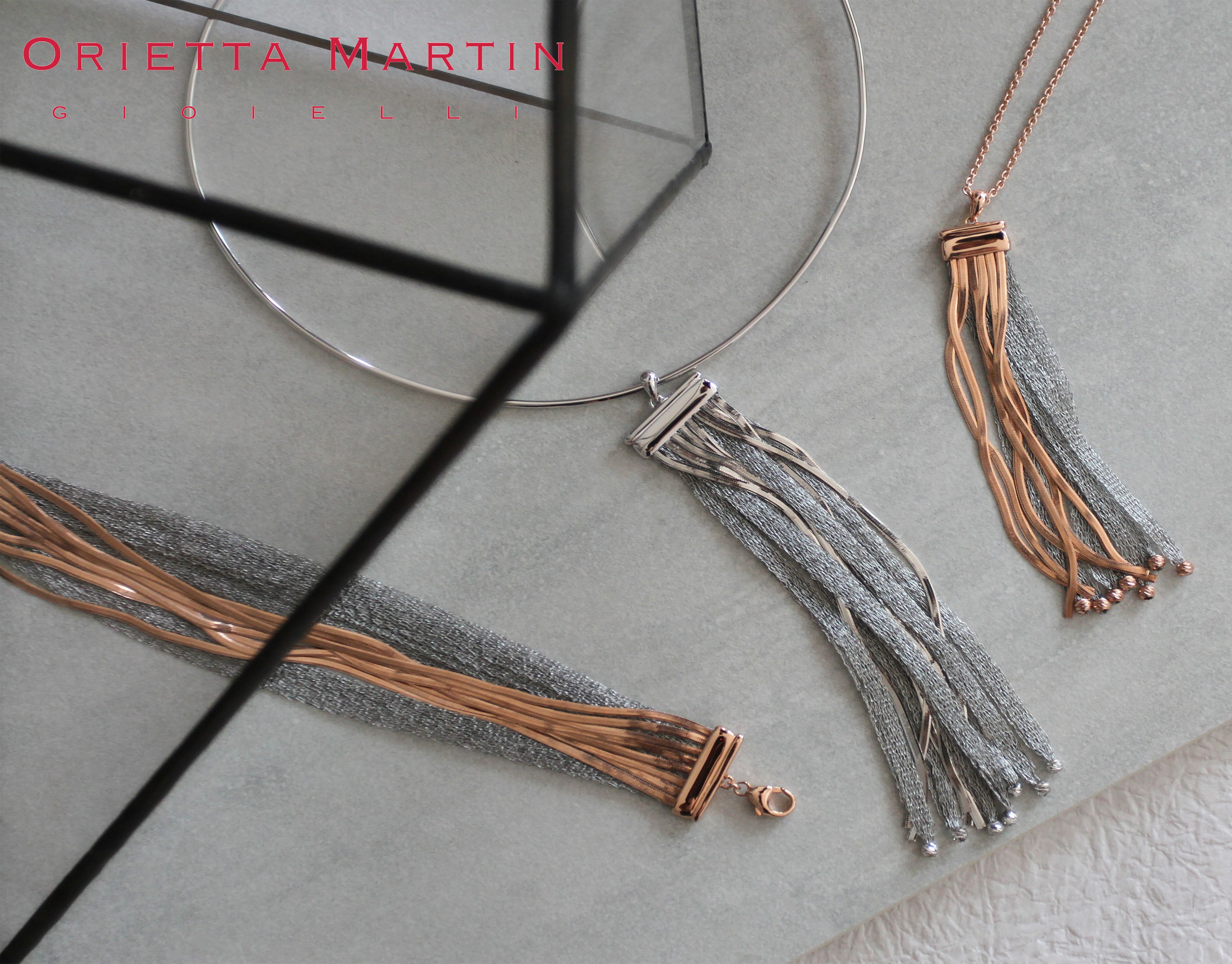 Gioielli系列以「結構即風格」為設計主軸,OMG-1715-06-1BH手鏈透過鍍銠銀鏈與啡色銅絲的交錯設計,象徵女性在生活中展現的理性與感性交融。金屬線條如建築般堅定,在手腕間低語,傳遞出佩戴者的獨立態度與細膩情感。