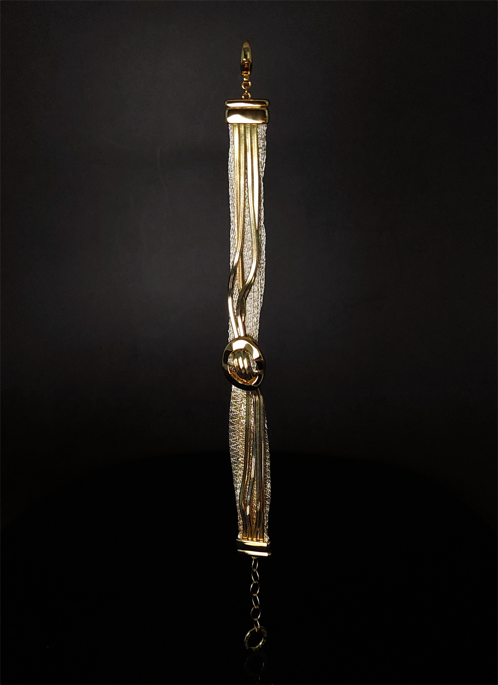 Gioielli系列以「結構即風格」為設計主軸,OMG-1715-06-2GG手鏈透過鍍金銀鏈與金色銅絲的交錯設計,象徵女性在生活中展現的理性與感性交融。金屬線條如建築般堅定,在手腕間低語,傳遞出佩戴者的獨立態度與細膩情感。