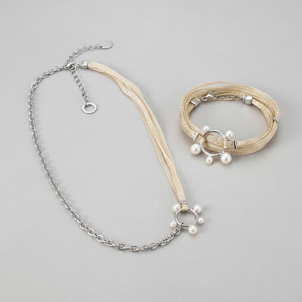 這款Missing系列首飾以獨特的設計概念為特色。整個系列採用不規則的造型,以金色金屬銅絲線或淡水珍珠相結合,營造出一種缺失感和神秘感。 手鏈同樣採用不規則的造型,以金色金屬銅絲線為主。鏈墜上也點綴了幾顆珍珠,增添了一絲優雅氣質。整體設計簡約大方,卻又蘊含著設計師的巧思。或許是刻意留下的空隙,或許是巧妙的組合,它給人一種難以捉摸的感覺。佩戴時將金色金屬銅絲線在手繞2圈,既獨特及時尚,更為佩戴者增添獨特的個人魅力。 材料/顔色 - 925純銀鍍銠 - 淡水珍珠 - 金色金屬銅絲線 - 長度35cm + 可調式鏈條長度3cm